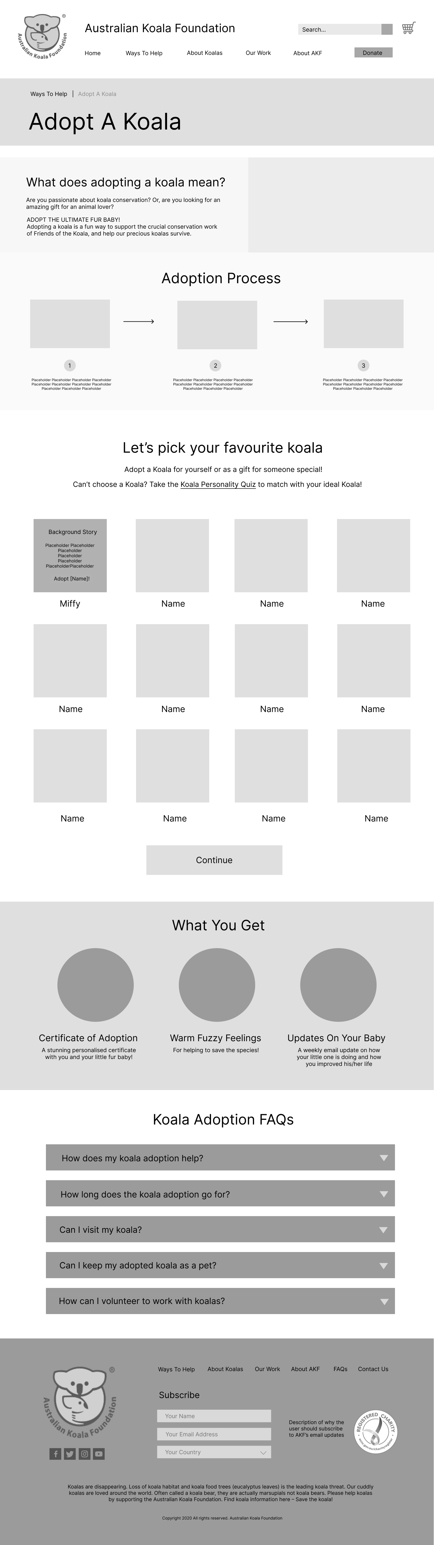The lo-fi adopt a koala page was very similar to the original websites page. From the start we wanted to include a flipping animation for each koala’s card.