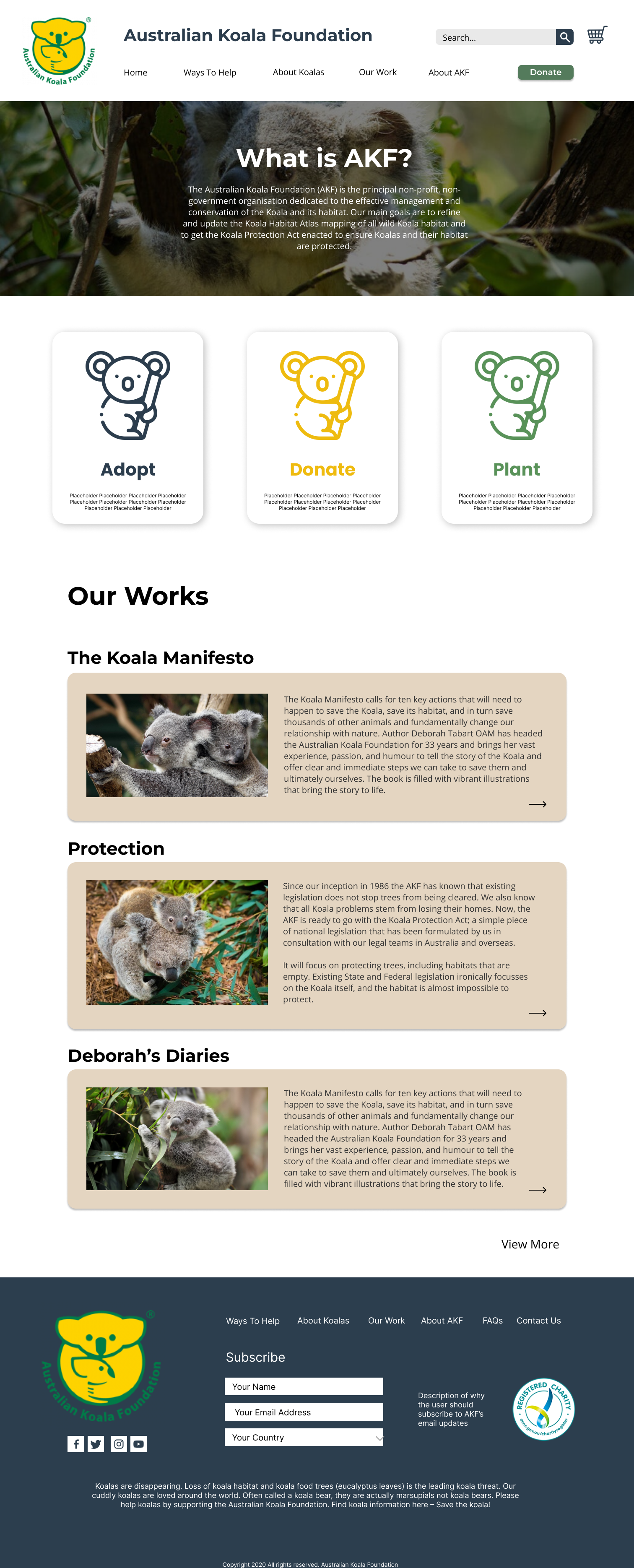 AKF is a koala and wildlife conservation nonprofit that focuses on expanding koala habitats and ensuring neighborhoods and conservation land are all koala safe. Our team redesigned the AKF website to streamline the experience for first-time users, thereby giving them a clearer understanding of the AKF mission and goals.