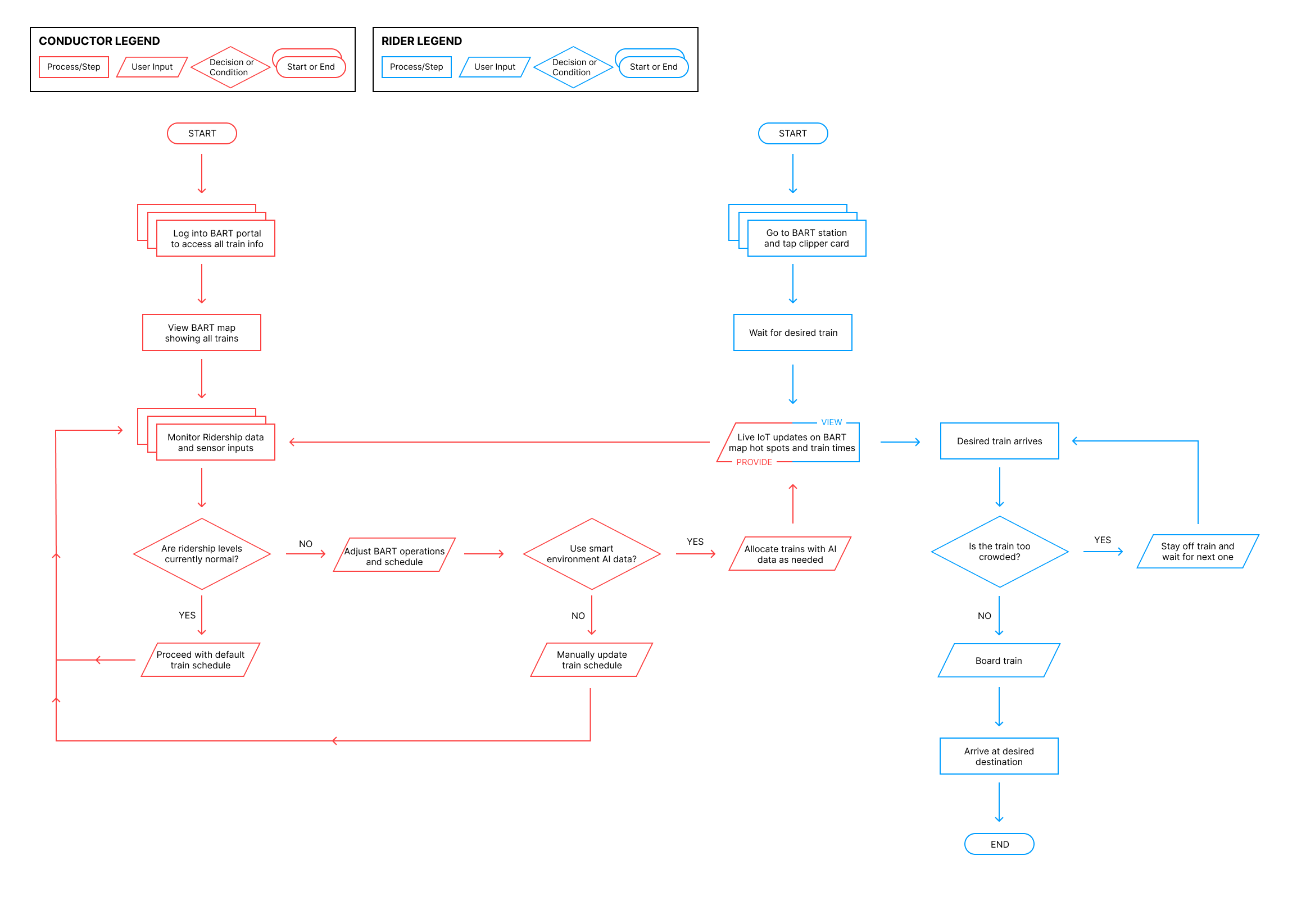 I felt it was necessary to show how the rider and conductor’s typical pathways would intersect. This would show how the system could satisfy both parties and stay in touch with both sides in live time.